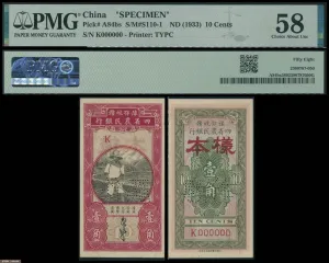 豫鄂皖赣四省农民银行1933年壹角样票,近未流通品相,评PMG 58。十分稀罕,PMG评分纪录中仅有5枚。