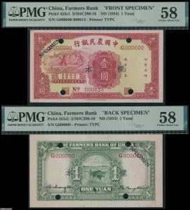 中国农民银行1934年大业版壹圆单面样张,正背面齐全,均近未流通品相,评PMG 58。此单面样张十分稀罕,PMG评分记录中仅有5枚正面和3枚背面。