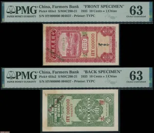 中国农民银行1935年壹角单面样张,正背面齐全,均未流通品相,评PMG 63。此单面样张十分稀罕,PMG评分记录中仅有5枚正面和4枚背面,这一对均为亚军分。