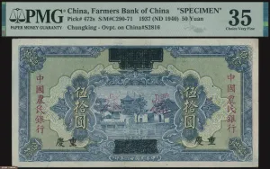 四川省政府建设库券改中国农民银行1940年重庆地名50圆样票,评PMG 35。十分稀罕,PMG评分纪录中仅有5枚。