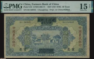 四川省政府建设库券改中国农民银行1940年重庆地名50圆,评PMG 15 NET。