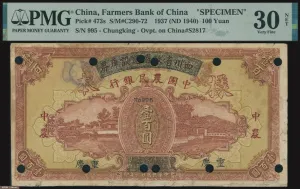 四川省政府建设库券改中国农民银行1940年重庆地名100圆样票,评PMG 30 NET。十分稀罕,PMG评分纪录中仅有6枚。