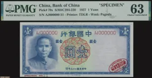 中国银行1937年德纳罗版1圆样票,未流通品相,评PMG 63。