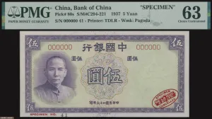 中国银行1937年德纳罗版5圆样票,未流通品相,评PMG 63。