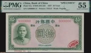 中国银行1937年德纳罗版10圆样票,近未流通品相,评PMG 55。