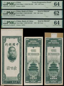 中国银行1941年100圆美钞版试模样票正面1张及背面2张,均未流通品相,分别评估PMG 62、64及64。此单面样张十分稀罕,PMG评分记录中仅有1枚正面和3枚背面,正面为冠军分、背面则为亚军和季军分。