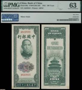 中国银行1941年美钞版100圆,是这一组票最关键一枚。未流通品相,评PMG 63。