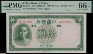 1937年中国银行德纳罗版10圆,狮子号#5555。完全未流通品相,评PMG 66EPQ。