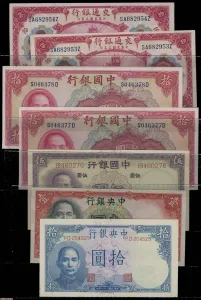 1914-42年一组民国四大行纸币,包括1914年交通银行上海地名10圆5枚 & 中国银行1940年10圆、1936年5圆 & 中央银行1936年壹圆、1942年10圆。另有多两枚山东省民生银行五圆。