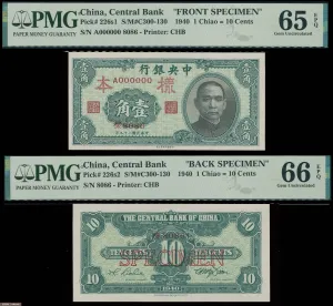 中央银行1940年中华书局版1角单面样张,正背面齐全,均未流通品相,分别评PMG 65EPQ及66EPQ。此单面样张非常罕少,PMG仅有5对评分,此对正面为亚军分,背面则为冠军分。