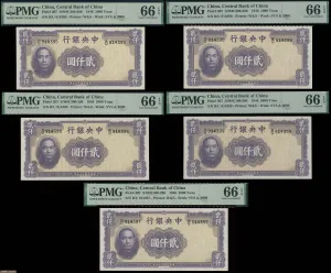 中央银行1946年华德路版2000圆5枚连号,均完全未流通品相,评PMG 66EPQ。