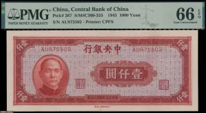 中央银行1945年中央版1000圆,完全未流通品相,评PMG 66EPQ。