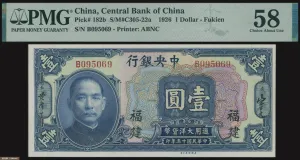 中央银行1926年美钞版福建地名1元,近未流通品相,评PMG58。