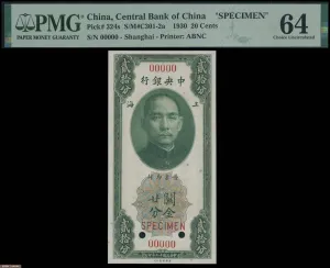 1930年中央银行美钞版上海地名关金20分样票,完全未流通品相,评PMG 64。