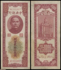 中央银行1948年中央版关金250000圆,八五品。